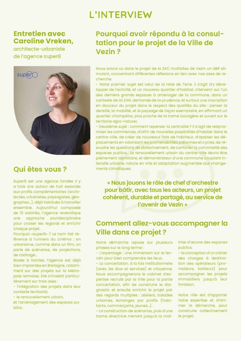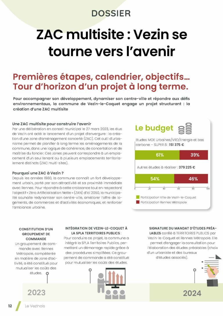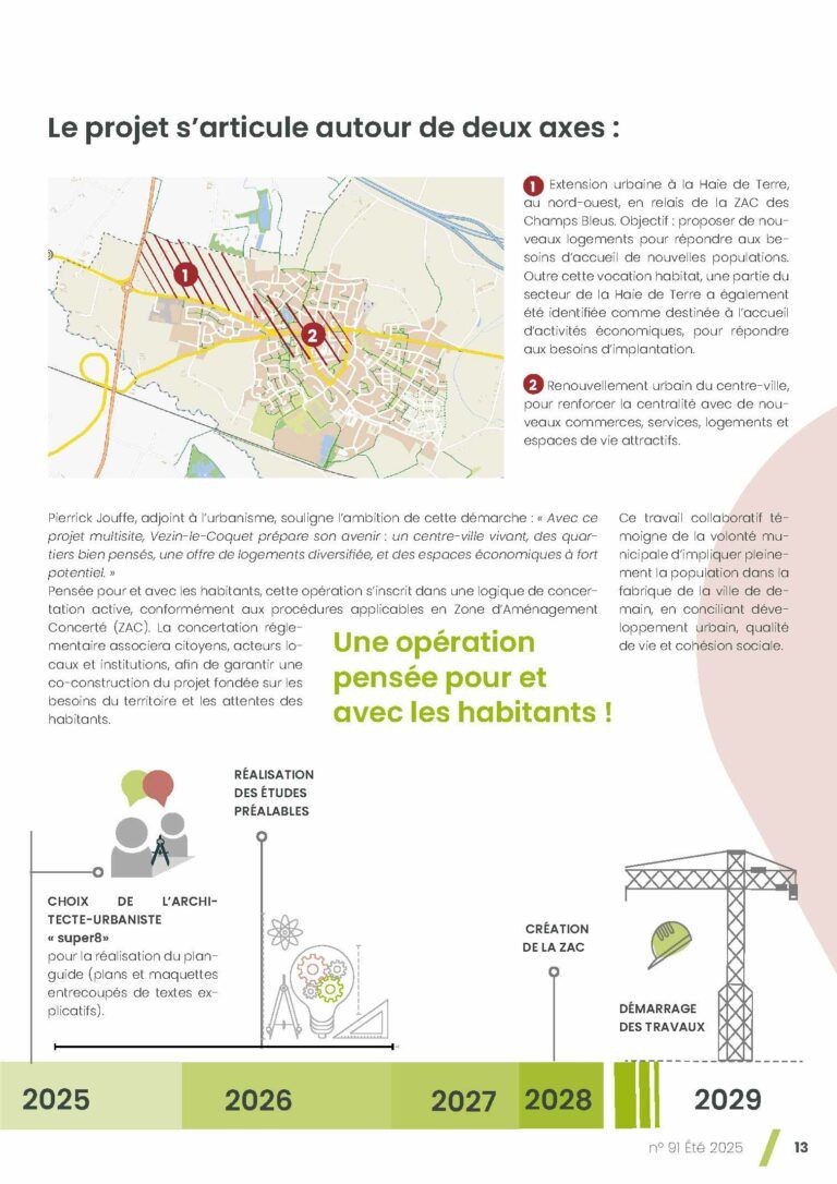 La commune de Vezin-le-Coquet lance une ZAC multisite pour accompagner sa croissance, revitaliser le centre-ville et atteindre l’objectif ZAN 2050. L’agence super8, architecte‑urbaniste du projet, conçoit un nouveau quartier à la Haie de Terre et recompose le centre‑ville autour de commerces, logements, îlots de fraîcheur et espaces publics conviviaux, dans une démarche de concertation avec habitants et acteurs locaux.